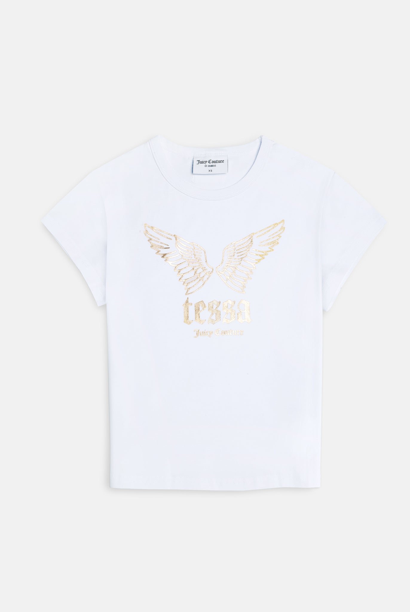 Upgrade your basics with the Tessa x Juicy Baby Capped Tee from the exclusive Juicy x Tessa collection. Made from soft cotton in a classic white shade, this tee features capped sleeves for a flattering fit and a bold gold foil graphic with angel wings across the chest.