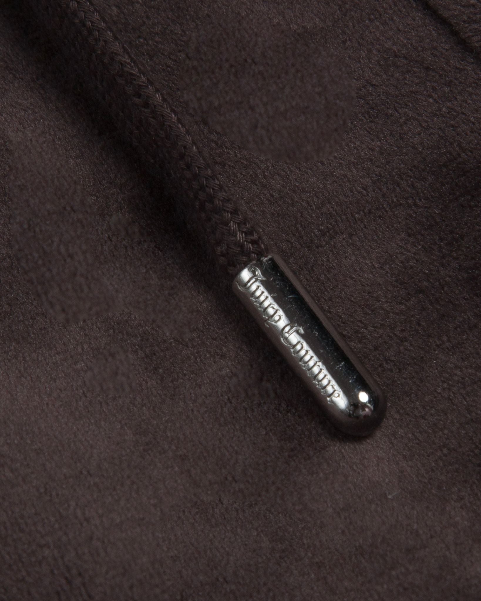 High-rise tracksuit bottoms in classic velour. Flared leg fit, with adjustable drawstring ribbed waist and front feature patch pockets. This Java x Tessa edition is finished with crystal-embellished gothic “Tessa” lettering at the hip, back popper fastening pockets and silver branded hardware. A bold reimagining of Juicy’s timeless velour silhouette, infused with Tessa’s unapologetic attitude.