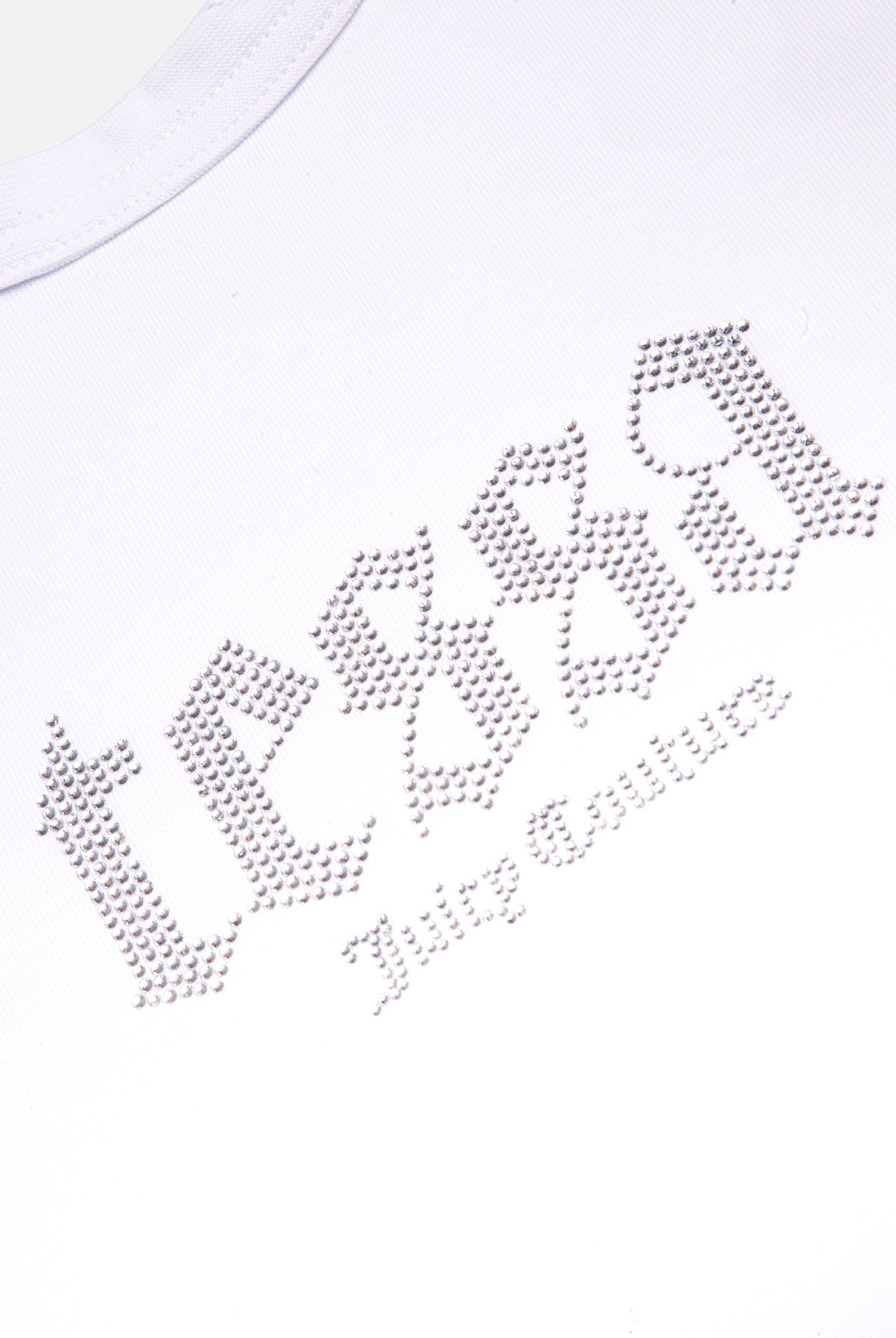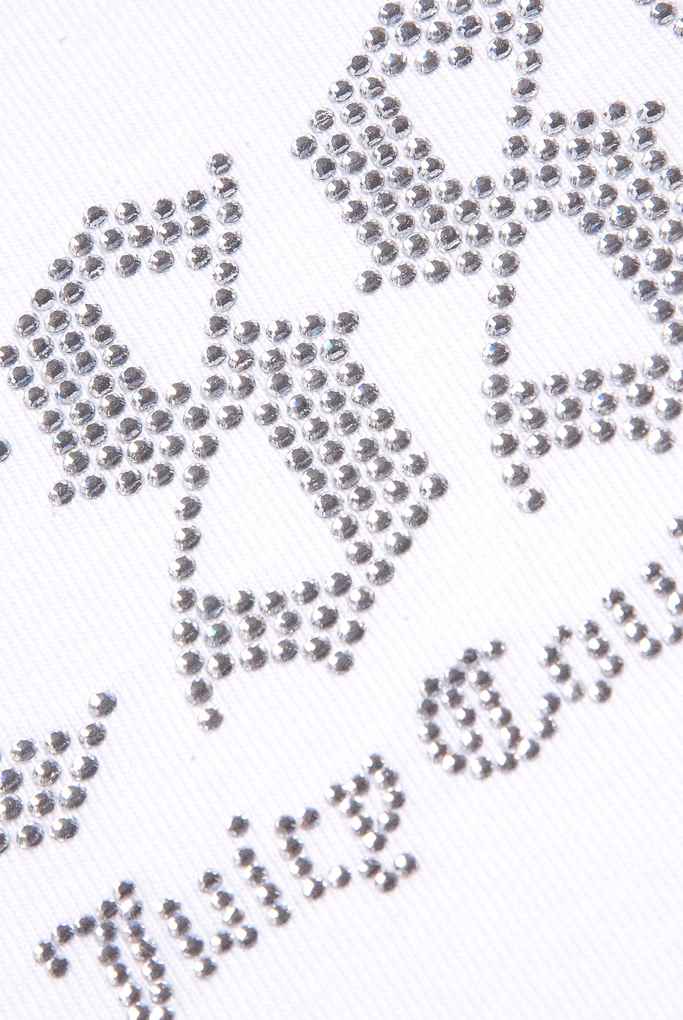 Add a touch of sparkle to your everyday wardrobe with the Tessa x Juicy Hilton Tee. Designed in crisp white cotton, this fitted tee showcases the signature “Tessa” logo embellished with rhinestones and Juicy Couture branding underneath.